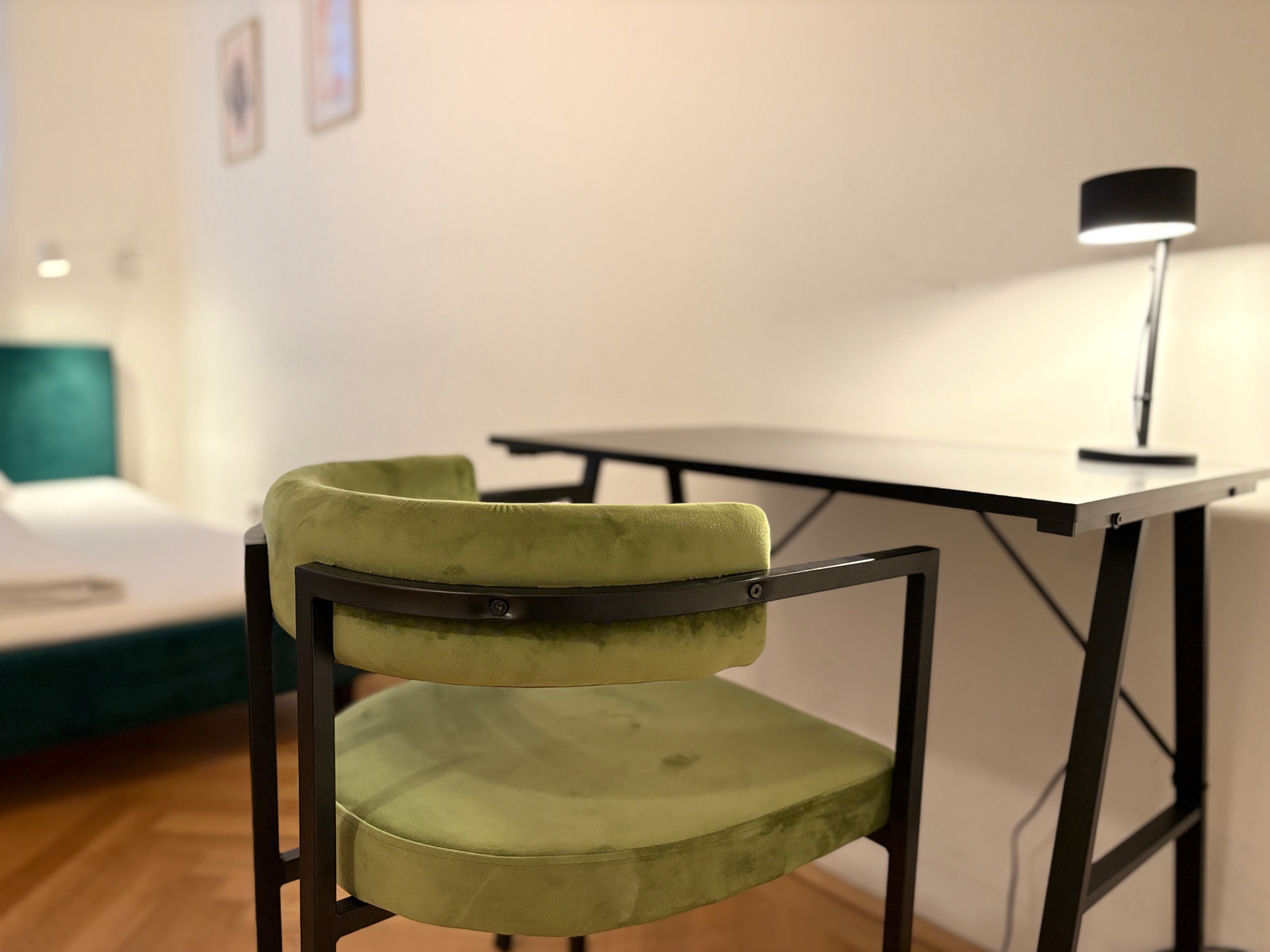 Die Wohnräume in der Traunfelsgasse verbinden den Charakter eines klassischen Wiener Altbaus mit einer modernen, hochwertigen Innenausstattung. Großzügige Raumhöhen, elegante Details und eine sorgfältig abgestimmte Möblierung prägen das Gesamtbild der Unterkunft.